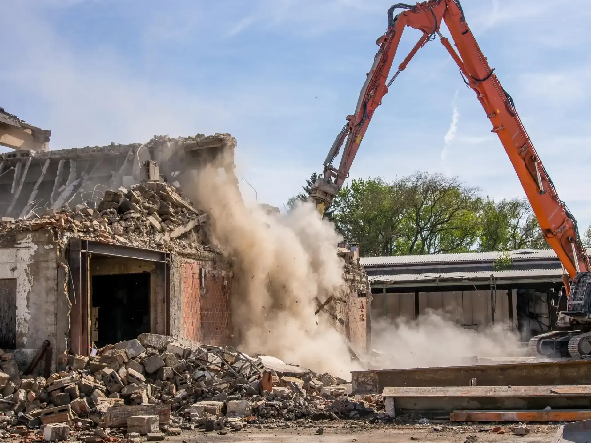 Used for larger whole-building site demolition, wrecking balls and at times low-grade explosives will be used to get the job done.